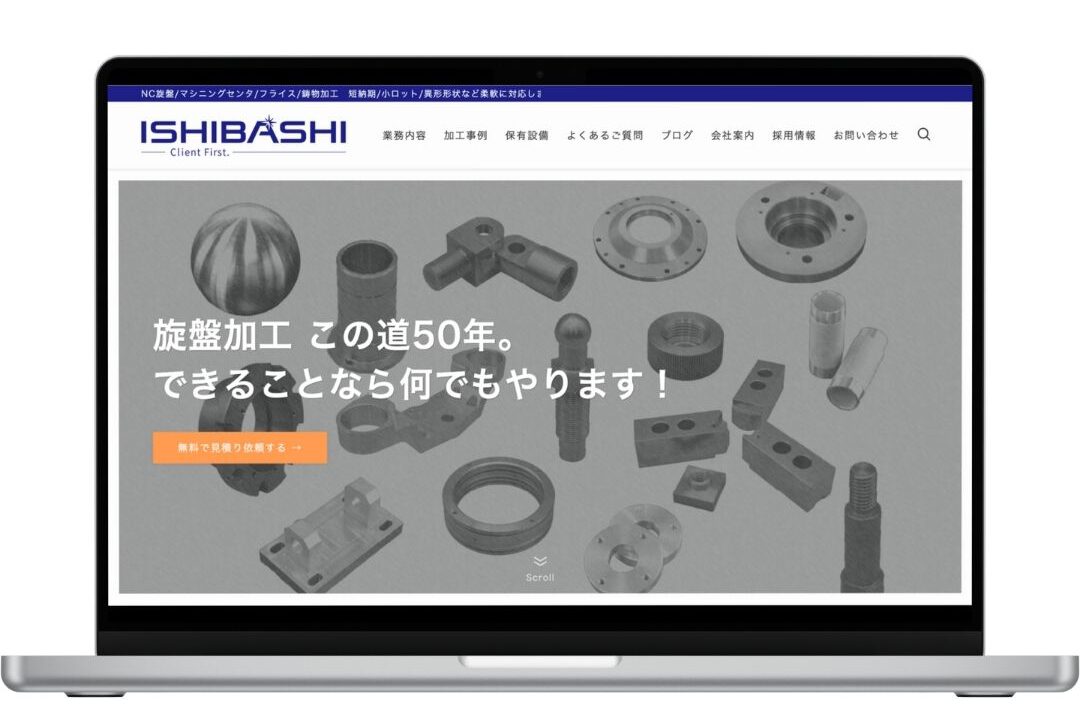 打ち合わせは全10回。特にメインコピーの 「旋盤加工 この道50年。できることなら何でもやります!」 は、言い切りの強さと信頼感のバランスを何度も見直して、約2ヶ月かけて粘り強く一緒に決めました。この言葉を軸に、サイト全体の打ち出しもブレないよう揃えています。